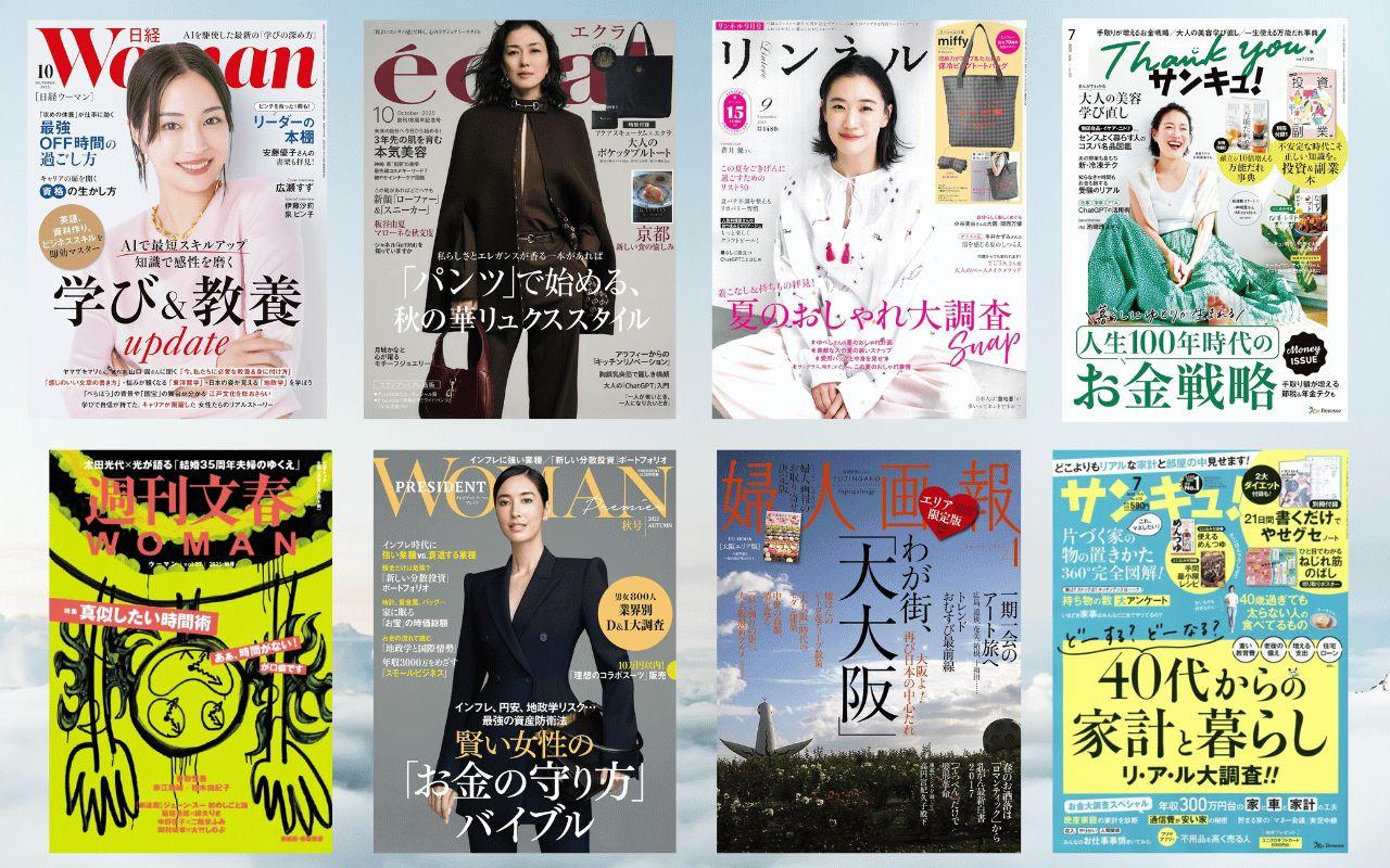 『日経WOMAN』(日経BP社)『エクラ eclat』(集英社)『週刊文春WOMAN』(文藝春秋)『サンキュ!』(ベネッセ)/『リンネル』(宝島社)/『子育てマップ』(Gakken)/『Kufura』(小学館)/『プレジデントウーマンプレミア』(プレジデント社)/『婦人画報』( ハースト婦人画報社)/『女性自身』(光文社)/クリエイターズセカンドライフ(翔泳社)/金融業界向け専門誌『しんくみ』(掲載予定・2026年)